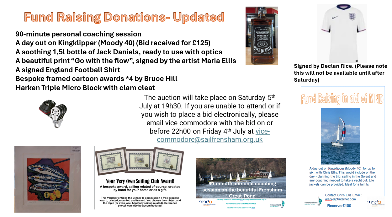 As part of the 10 hour race prize giving and evening meal we are planning an auction. If you are unable to attend, but would like to place a bid, then please e-mail Vice-Commodore@sailfrensham.org,uk by 22:00 on Friday 4th July, with your bids. On the day you will be able to write a bid on a bidding sheet if you will not be around at the end of the evening. Below is a flyer showing the items available